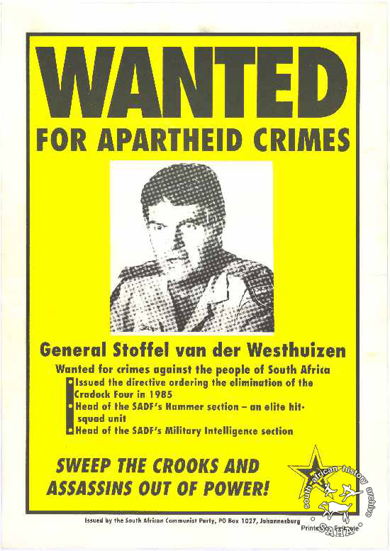 WANTED FOR APARTHEID CRIMES : General Stoffel van der Westhuizen : SWEEP THE CROOKS AND ASSASSINS OUT OF POWER |
