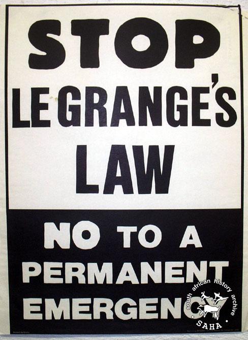 This poster is silkscreened black and red, produced by DESCOM, Johannesburg. This poster was produced to protest the introduction by the then Minister of Law and Order of laws further suppressing democratic rights. The main text reads: "STOP Le Grange BILLS! : JUNE 16 : AWAY WITH BANTU EDUC. : FORWARD TO PEOPLE'S EDUCATION : RALLY : ALEX STADIUM". Reproduced in "Images of Defiance: South African Resistance posters in the 1980s" on page 140 (number 255) of the 1991 SAHA / Ravan Press edition and the 2004 SAHA / STE Publishers edition. It has also been included in the SAHA virtual exhibition - 'The Future is Ours: Commemorating Youth in the Struggle'. |