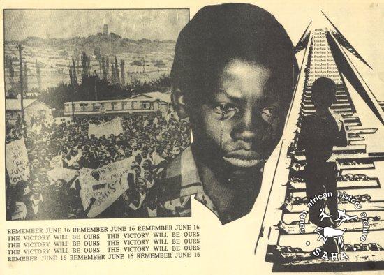 This poster is an offset litho in black. The image features a photomontage of children; the central image is of a black child crying; other images include a photograph of a small black child walking on railway tracks and a photograph of a crowd of protesters. The main text reads: "REMEMBER JUNE 16 : THE VICTORY WILL BE OURS".