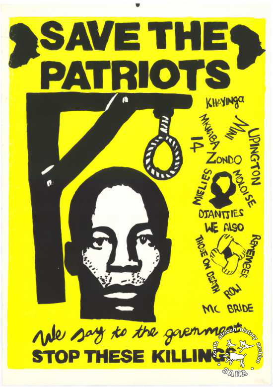This poster is silkscreened black and yellow, created by the Port Elizabeth Inter-organisation Media Committee. This poster demanded an end to the proposed hangings of a number of political prisoners. The text reads “SAVE THE PATRIOTS : We say to the government : STOP THESE KILLINGS” Digitised by Specialised Archival Solutions in 2009. Reproduced in "Images of Defiance: South African Resistance posters in the 1980s" on page 155 (number 284) of the 1991 SAHA / Ravan Press edition and the 2004 SAHA / STE Publishers edition. |