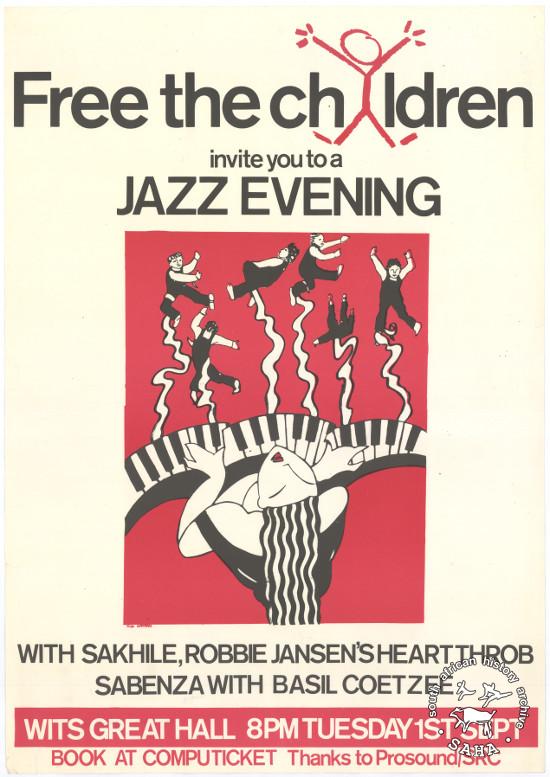 This poster is silkscreened black and red, produced by the Free the Children Alliance, Johannesburg. This image depicts a jazz evening that was advertised in c 1986 to raise awareness and financial support. The text reads: “Free the children invite you to a JAZZ EVENING “Digitised by Specialised Archival Solutions in 2009. Reproduced in "Images of Defiance: South African Resistance posters in the 1980s" on page 91 (number 164) of the 1991 SAHA / Ravan Press edition and the 2004 SAHA / STE Publishers edition. Duplicate poster: AL2446_3964 |