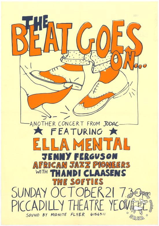 This is a silkscreened poster in blue and orange, issued by the Johannesburg Democratic Action Committee (JODAC) for a concert at Piccadilly Theatre, Yeoville on Sunday, 21 October, circa 1984. The text reads: "THE BEAT GOES ON... : ANOTHER CONCERT FROM JODAC FEATURING ELLA MENTAL : JENNY FERGUSON : AFRICAN JAZZ PIONEERS WITH THANDI CLAASENS : THE SOFTIES". This poster was digitised by Specialised Archival Solutions in 2009. Included in the SAHA physical and virtual exhibitions 'What you won't hear on the radio' developed to mark the 30th birthday of Shifty Records and the 25th anniversary of the Voƫlvry tour. |