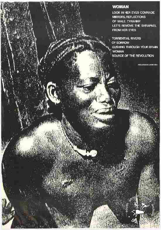 This poster is an offset litho in black. It features a photograph of a woman and the poem "Woman" by Abduraghiem Johnstone. The text, in full, reads: "WOMAN : LOOK IN HER EYES COMRADE : MIRRORS, REFLECTIONS : OF MALE TYRANNY : LET'S REMOVE THE SHRAPNEL : FROM HER EYES : : TORRENTIAL RIVERS : OF SORROW : GUSHING THROUGH YOUR BRAIN : WOMAN : SOURCE OF THE REVOLUTION : ABDURAGHIEM JOHNSTONE".