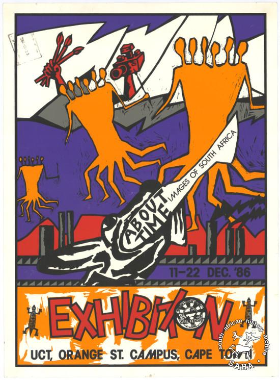 This poster is silkscreened black, red, ochre, grey and purple, produced for the Arts Festival, Cape Town. This poster refers to an exhibition of visual art as part of the Arts Festival. The text reads: “ABOUT TIME : IMAGES OF SOUTH AFRICA : EXHIBITION” on page 161 (number 287) of the 1991 SAHA / Ravan Press edition and the 2004 SAHA / STE Publishers edition. |