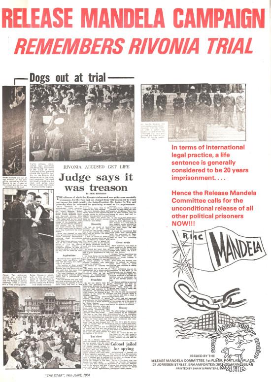 This is an offset litho poster, issued by the Release Mandela Campaign, circa 1985. The text reads: "RELEASE MANDELA CAMPAIGN REMEMBERS RIVONIA TRIAL..." This poster was digitised by Specialised Archival Solutions in 2009. Included in SAHA's virtual exhibition 'Tracing the unbreakable thread: non-racialism in South Africa |