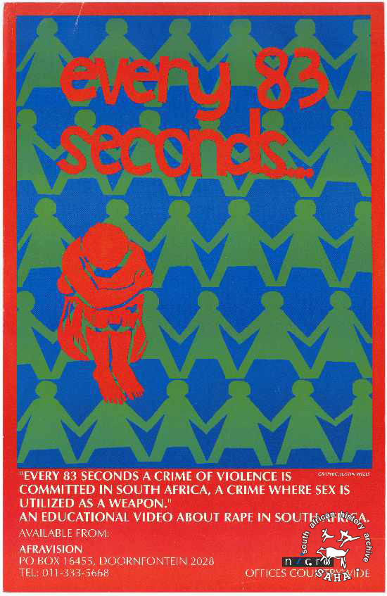 This poster is an offset litho in blue and green on red. The text reads: "every 83 seconds... : "EVERY 83 SECONDS A CRIME OF VIOLENCE IS COMMITTED IN SOUTH AFRICA, A CRIME WHERE SEX IS UTILIZED AS A WEAPON." : AN EDUCATION VIDEO ABOUT RAPE IN SOUTH AFRICA. : AVAILABLE FROM: : AFRAVISION : PO BOX 16455, DOORNFONTEIN 2028 : TEL: 011-333-5668 : NICRO (logo) : OFFICES WORLDWIDE".