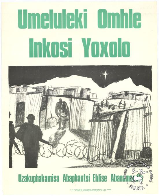 This poster is an offset litho in black and green, produced by the Ecumerical Action Movement. This image refers to a squatters’ prayer whereby he prays that ‘The Lord of mercy is my best guide. He shall raise the humble and humble the powerful’. The text reads “Umeluleki Omhle Inkosi Yoxolo: Uzakuphakamisa Abaphansi Ehlise Abanamandla” Digitised by Specialised Archival Solutions in 2009. Reproduced in "Images of Defiance: South African Resistance posters in the 1980s" on page 81 (number 142) of the 1991 SAHA / Ravan Press edition and the 2004 SAHA / STE Publishers edition |