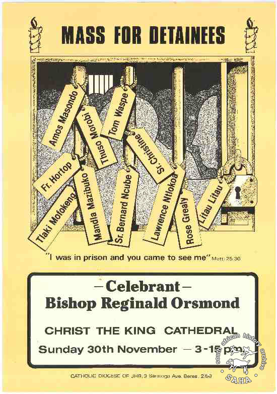 This poster is an offset litho in black and yellow, produced by the Catholic Diocese of Johannesburg. This poster advertised mass for detainees, which was led by the Catholic Diocese of Johannesburg. The text reads “MASS FOR DETAINEES : "I was in prison and you came to see me"”Digitised by Specialised Archival Solutions in 2009. Reproduced in "Images of Defiance: South African Resistance posters in the 1980s" on page 101 (number 189) of the 1991 SAHA / Ravan Press edition and the 2004 SAHA / STE Publishers edition. It also appears on page 187 of “Red on Black: The Story of the South African Poster Movement”, SAHA / STE Publishers, 2007. |