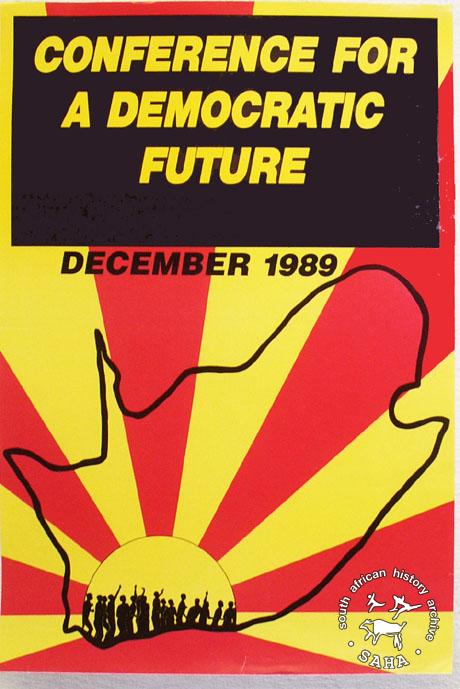 This poster is an offset litho in black, red and yellow,produced by the Conference for A Democratic Future (CDF) organising committee, Johannesburg. This poster advertises The Conference for a Democratic Future, which attempted to unite all organisations involved in the struggle against apartheid. The text reads “CONFERENCE FOR A DEMOCRATIC FUTURE : DECEMBER 1989” Digitised by Specialised Archival Solutions in 2009. Reproduced in "Images of Defiance: South African Resistance posters in the 1980s" on page 38 (number 58) of the 1991 SAHA / Ravan Press edition. |