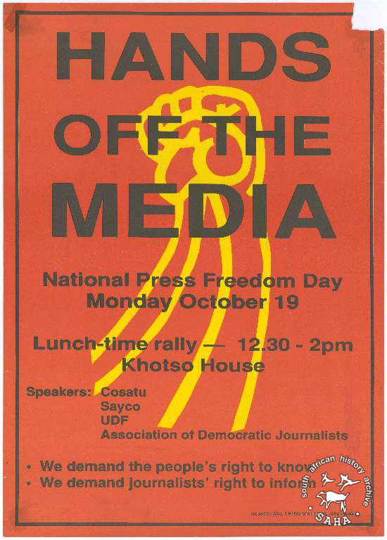 This poster is an offset litho in black, red and yellow, produced by ADJ, Johannesburg. This poster advertises a rally to protest state interference in the freedom of press. The text reads “Hands of the Media: National Press Freedom Day” Digitised by Specialised Archival Solutions in 2009. Reproduced in "Images of Defiance: South African Resistance posters in the 1980s" on page 176 (number 322) of the 1991 SAHA / Ravan Press edition and the 2004 SAHA / STE Publishers edition. |