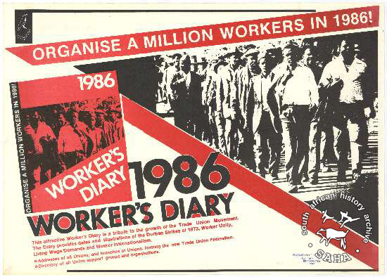 This poster is an offset litho in black, red and yellow. The caption reads: "ORGANIZE A MILLION WORKERS IN 1986! : 1986 WORKER'S DIARY". |