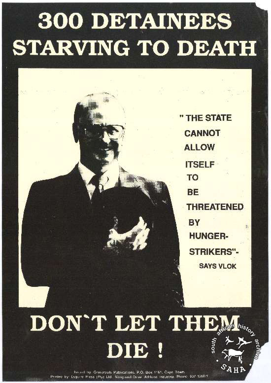 This is an offset litho poster in black dealing with hunger strikes amongst detainees during the Apartheid era. |