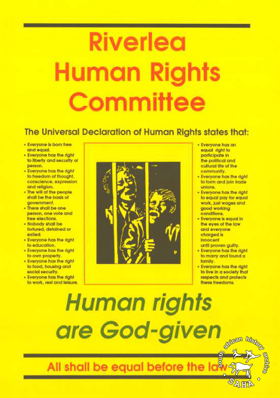 ► 1915 :: Riverlea Human Rights Committee : The Universal Declaration of Human Rights states that: : Human rights are God-given : All shall be equal before the law