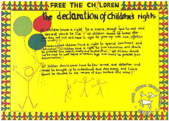 This poster is an offset litho in black, red, yellow, blue and green, produced by the Free The Children Alliance, Johannesburg. This poster refers to an English version of the International Declaration of Children's Rights that was printed at a time when hundreds of children were in detention. The text reads “FREE THE CHILDREN: the declaration of children's rights”Digitised by Specialised Archival Solutions in 2009. Reproduced in "Images of Defiance: South African Resistance posters in the 1980s" on page 90 (number 161) of the 1991 SAHA / Ravan Press edition and the 2004 SAHA / STE Publishers edition. |