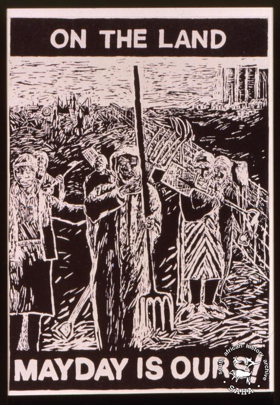 This poster is silkscreened black, produced by the Gardens Media Group at Community Arts Project (CAP), Cape Town. This poster is one set of five posters celebrating May Day which was created by various artists, such as Justin Wells, Billy Mandandini, and others. The text reads “ON THE LAND MAYDAY IS OURS!” Digitised by Specialised Archival Solutions in 2009. Reproduced in "Images of Defiance: South African Resistance posters in the 1980s" on page 69 (number 122-125) of the 1991 SAHA / Ravan Press edition and the 2004 SAHA / STE Publishers edition. It also appears on page 197 of “Red on Black: The Story of the South African Poster Movement”, SAHA / STE Publishers, 2007 |