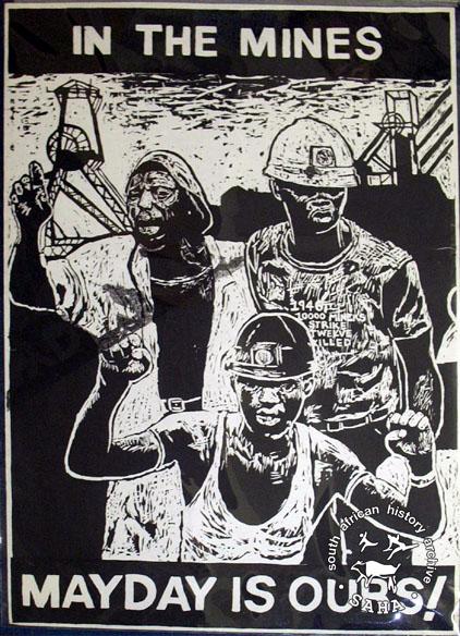 This poster is silkscreened black and,produced by the Gardens Media Project at CAP, Cape Town. This poster is one of a set of five posters produced to highlight the 1 May- May Day, as an official public holiday in South Africa. The text reads “IN THE MINES : MAYDAY IS OURS!”Digitised by Specialised Archival Solutions in 2009. Reproduced in "Images of Defiance: South African Resistance posters in the 1980s" on page 69 (number 122) of the 1991 SAHA / Ravan Press edition |