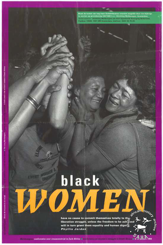This is an offset litho poster in purple, yellow green and black. It was issued by Stichting Malibongwe p/a Anti-Apartheid Beweging Nederland. The main text reads: "black WOMEN have no cause to commit themselves totally to the liberation struggle, unless the freedom to be achieved will in turn grant them equality and human dignity. Phyllis Jordan". |