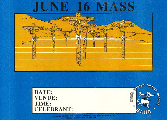This poster is an offset litho in black, blue, yellow and white. The central image is a drawing of eight crucifixes. The main text reads: "JUNE 16 MASS : DATE: : VENUE: : TIME: : CELEBRANT: : Issued by JUSTICE AND PEACE COMMISSION, AND YOUTH DEPARTMENT : Khanya House, Box 941 Pretoria 0001".