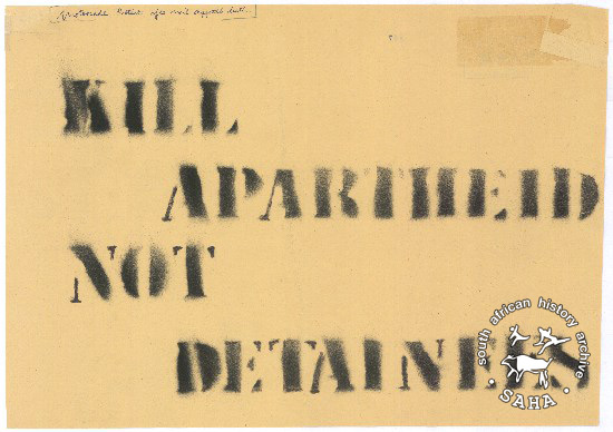 This poster is stencilled in black. This poster was used in the motorcycle protest held after Neil Agget's death. The text reads “KILL APARTHEID NOT DETAINEES” Digitised by Specialised Archival Solutions in 2009. Reproduced in "Images of Defiance: South African Resistance posters in the 1980s" on page 153 (number 281) of the 1991 SAHA / Ravan Press edition and the 2004 SAHA / STE Publishers edition. |