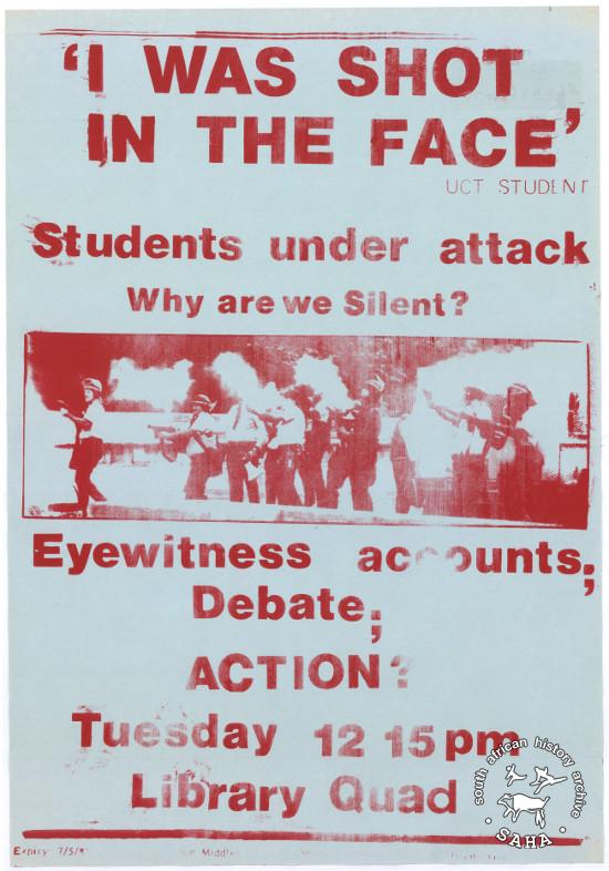 This poster is silkscreened red, produced by the University of Cape Town students. This poster refers to the University of Cape Town and how they met to discuss police violence against students. The text reads: “'I WAS SHOT IN THE FACE' : Students under attack : why are we Silent? : Eyewitness accounts; Debate; ACTION?” on page 122 (number 222) of the 1991 SAHA / Ravan Press edition and the 2004 SAHA / STE Publishers edition. |