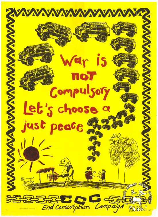 This is an offset litho poster in black and red on yellow, issued by the End Conscription Campaign (ECC), date unknown. This poster was digitised by Specialised Archival Solutions in 2009. |