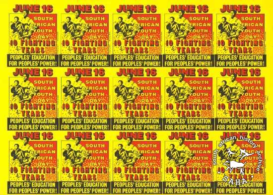 This offset litho poster in red and black on yellow resembles a sheet of unused stickers and was issued by the Transvaal Students' Congress (TRASCO) in 1986. The text reads: "JUNE 16 : SOUTH AFRICAN YOUTH DAY : 10 YEARS FIGHTING POWER : PEOPLES' EDUCATION : FOR PEOPLES' POWER".