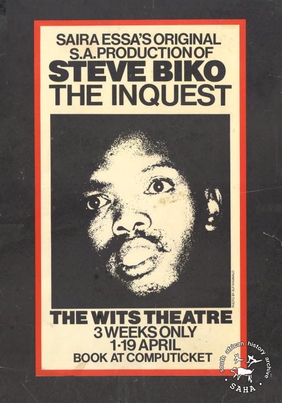 This offset litho poster in black, red and yellow for Saira Essa's original South african production of 'Steve Biko: the inquest' was probably issued by the Wits Theatre, circa 1985. The text reads: "SAIRA ESSA'S ORIGINAL S.A. PRODUCTION OF : STEVE BIKO : THE INQUEST". This poster was digitised by Specialised Archival Solutions in 2009.