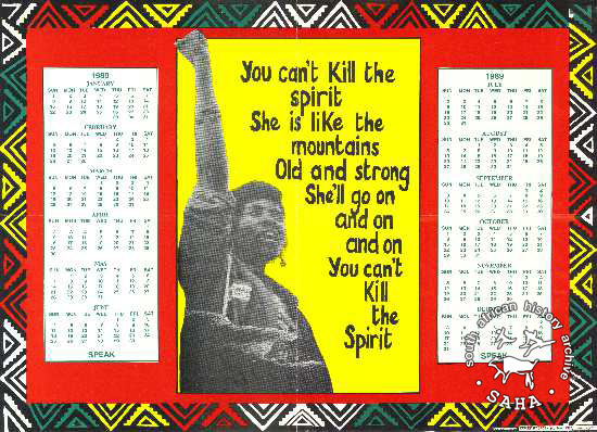 This poster is an offset litho in black, green, red and yellow. It is a calendar and features the image of a woman with her fist in the air, as well as a poem. The text reads: "You can't kill the spirit : She is like the mountains : Old and strong : She'll go on and on and on : You can't kill the spirit".