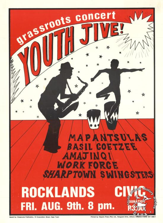 This poster is an offset litho in black and red, produced by the Grassroots Publications, Cape Town. This poster advertised local bands playing at a concert that was organized by a community newspaper. The text reads: “grassroots concert : YOUTH JIVE!” on page 166 (number 302) of the 1991 SAHA / Ravan Press edition and the 2004 SAHA / STE Publishers edition. |