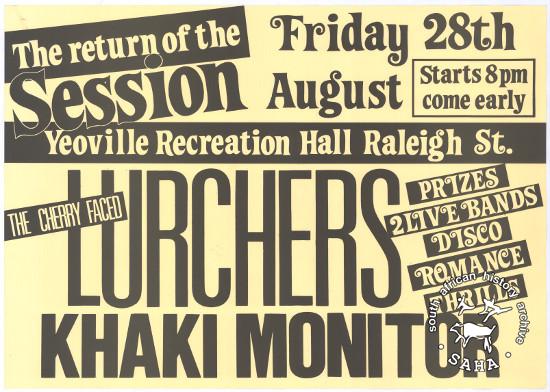 This is an offset litho poster in black and white for a performance by the Cherry Faced Lurchers and Khaki Monitor at the Yeoville Recreation Hall on 28 August 1987. The text reads: "The return of the Session : Yeoville Recreation Hall Raleigh St. : THE CHERRY FACED LURCHERS : KHAKI MONITOR". This poster was digitised by Specialised Archival Solutions in 2009. Included in the SAHA physical and / or virtual exhibitions 'What you won't hear on the radio' developed to mark the 30th birthday of Shifty Records and the 25th anniversary of the Voƫlvry tour. |
