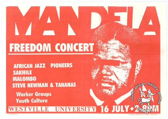This is an offset litho poster in red and white issued by the Mandela Birthday Committee for a Mandela Freedom Concert at Westville University on 16 July, year unknown. The text reads: "MANDELA FREEDOM CONCERT : AFRICAN JAZZ PIONEERS : SAKHILE ; MALOMBO : STEVE NEWMAN & TANANAS : Worker Groups : Youth Culture". This poster was digitised by Specialised Archival Solutions in 2009. Included in the SAHA physical and / or virtual exhibitions 'What you won't hear on the radio' developed to mark the 30th birthday of Shifty Records and the 25th anniversary of the Voƫlvry tour. |