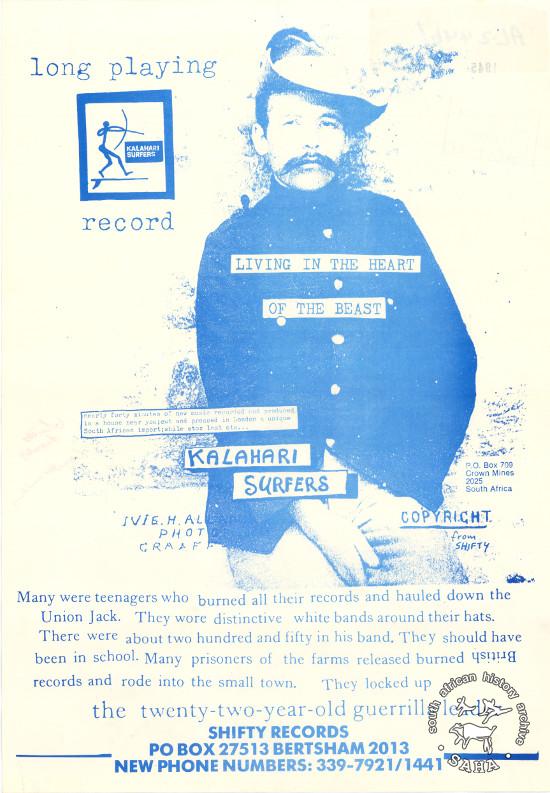 This is an offset litho poster in blue and white issued by Shifty Records for the release of the album 'Living in the Heart of the Beast' by the Kalahari Surfers in 1985 . The text reads: "long playing record : LIVING IN THE HEART OF THE BEAST : KALAHARI SURFERS : Many were teenagers who burned all their records and hauled down the Union Jack. They wore distinctive white bands around their hats... ". This poster was digitised by Specialised Archival Solutions in 2009. Included in the SAHA physical and / or virtual exhibitions 'What you won't hear on the radio' developed to mark the 30th birthday of Shifty Records and the 25th anniversary of the Voƫlvry tour. |