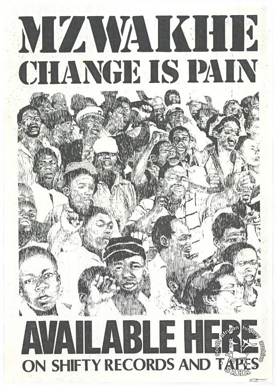 This is an offset litho poster in black and white, issued by Shifty Records for the release of the album 'Change is Pain' by Mzwakhe Mbuli, circa 1986. The text reads: "MZWAKHE : CHANGE IS PAIN : AVAILABLE HERE ON SHIFTY RECORDS AND TAPES". This poster was digitised by Specialised Archival Solutions in 2009. Included in the SAHA physical and / or virtual exhibitions 'What you won't hear on the radio' developed to mark the 30th birthday of Shifty Records and the 25th anniversary of the Voƫlvry tour. |