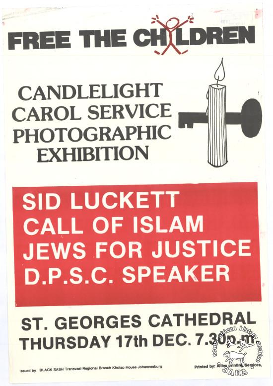 This poster is an offset litho in black and red, produced by the Black Sash in 1986, Johannesburg. This poster depicts different religious groups uniting to protest against the detention of children under the State of Emergency. The text reads “FREE THE CHILDREN : CANDLELIGHT CAROL SERVICE : PHOTOGRAPHIC EXHIBITION” Digitised by Specialised Archival Solutions in 2009. Reproduced in "Images of Defiance: South African Resistance posters in the 1980s" on page 98 (number 182) of the 1991 SAHA / Ravan Press edition |