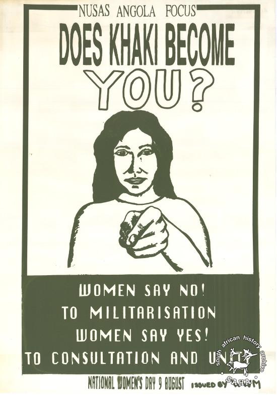 NUSAS ANGOLA FOCUS : DOES KHAKI BECOME YOU? : WOMEN SAY NO! TO MILITARISATION : WOMEN SAY YES! TO CONSULTATION AND UNITY : NATIONAL WOMEN'S DAY 9 AUGUST |