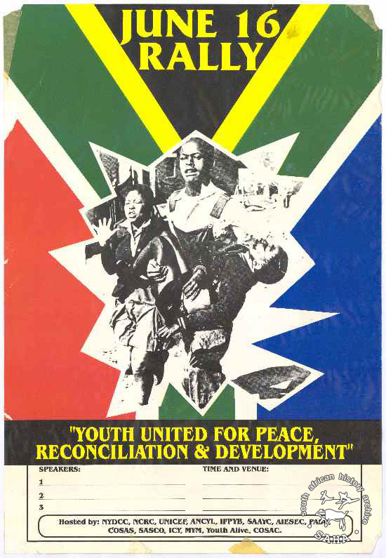 This poster is an offset litho in black, green, yellow, red and blue. It features an image of Hector Pieterson. The text reads: "JUNE 16 RALLY : "YOUTH UNITED FOR PEACE, RECONCILIATION & DEVELOPMENT" : SPEAKERS: TIME AND VENUE: : 1 : 2 : 3 : Hosted by: NYDCC, NCRC, UNICEF, ANCYL, IFPYB, SAAYC, AIESEC, PASO, : COSAS, SASCO, ICY, MYM, Youth Alive, COSAC."