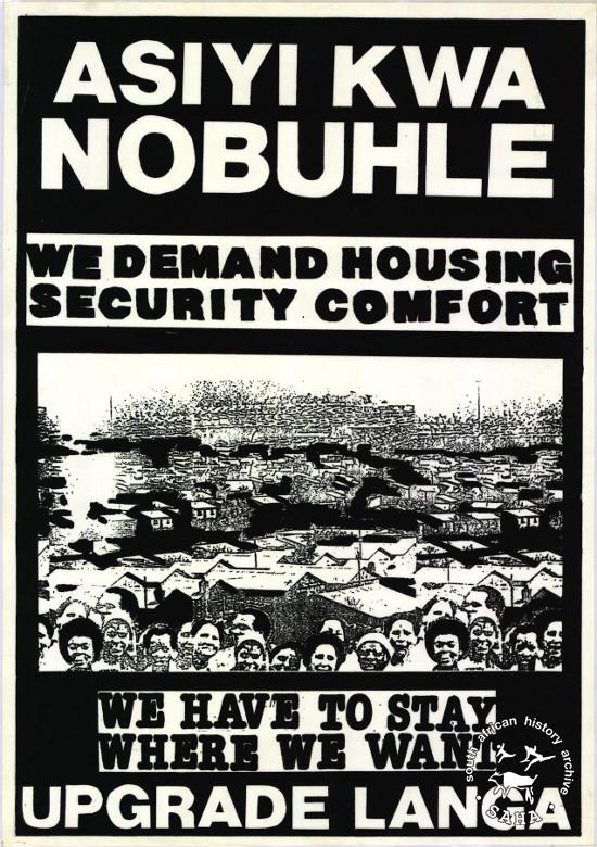 This poster is silkscreened black, produced for Langa residents at the Screening Training Program (STP), Johannesburg. This poster refers to housing demands conducted by the people of Langa, in the Eastern Cape. They demanded housing for all. The text reads “ASIYI KWA NOBUHLE: WE DEMAND HOUSING SECURITY AND COMFORT: WE HAVE TO STAY WHERE WE WANT: UPGRADE LANGA” Digitised by Specialised Archival Solutions in 2009. Reproduced in "Images of Defiance: South African Resistance posters in the 1980s" on page 81 (number 143) of the 1991 SAHA / Ravan Press edition and the 2004 SAHA / STE Publishers edition |