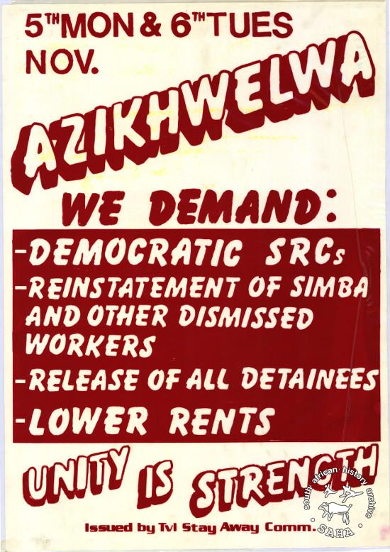 5TH MON & 6TH TUES NOV. AZIKHWELWA : WE DEMAND: - DEMOCRATIC... : UNITY IS STRENGTH |