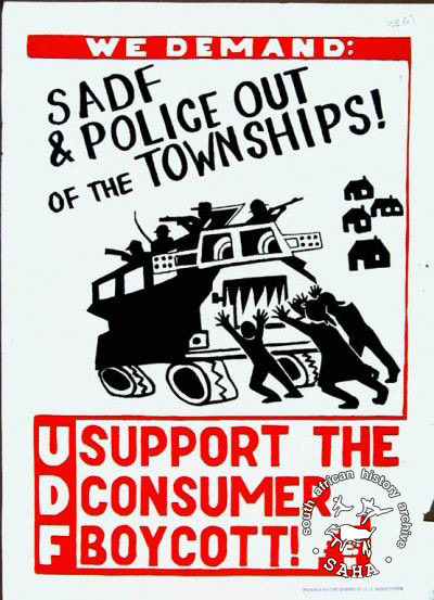 WE DEMAND: SADF & POLICE OUT OF THE TOWNSHIPS! : UDF : SUPPORT THE CONSUMER BOYCOTT! |