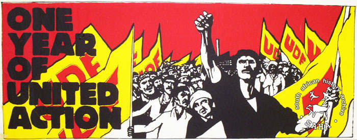 This poster is silkscreened black, yellow and red, produced by the UDF at the Screen Training Project (STP), Johannesburg. This poster refers to the UDF and how their first year was marked by the unity and action of its 600 affiliates. The text reads “AONE YEAR OF UNITED ACTION”Digitised by Specialised Archival Solutions in 2009. Reproduced in "Images of Defiance: South African Resistance posters in the 1980s" on page 29 (number 38) of the 1991 SAHA / Ravan Press edition and the 2004 SAHA / STE Publishers edition. |