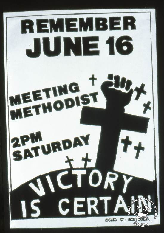 This poster is silkscreened black, produced by AYCO and COSAS; Johannesburg. This poster refers to the youth and students reaffirming their determination their determination to fight until victory is received. The text reads: " REMEMBER JUNE 16 : MEETING METHODIST : 2PM SATURDAY : Victory is certain". Digitised by Specialised Archival Solutions in 2009. Reproduced in "Images of Defiance: South African Resistance posters in the 1980s" on page 107 (number 192) of the 1991 SAHA / Ravan Press edition and the 2004 SAHA / STE Publishers edition. It is also included in SAHA virtual exhibition - 'The Future is Ours: Commemorating Youth in the Struggle'