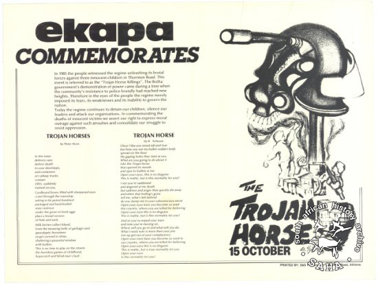 This offset litho poster in black on white commemorates the "Trojan Horse Massacre" - a police ambush during the state of emergency in which 3 young people were killed and 13 others injured on Thornton Road in Athlone, Cape Town on October 15, 1985. This poster was digitised in 2009. |