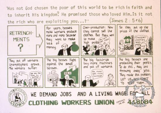 This poster is silkscreened black and green, produced for the Clothing Workers Union (CLOWU) by the Community Arts Program (CAP), Cape Town. This image depicts a cartoon that CLOWU wanted to use to educate workers. The text reads “WE DEMAND JOBS AND A LIVING WAGE FOR ALL "Has not God chosen the poor of this world to be rich in faith and to inherit His kingdom? He promised those who loved Him. Is it not the rich who are exploiting you...?"(James2:5&6)”.Digitised by Specialised Archival Solutions in 2009. Reproduced in "Images of Defiance: South African Resistance posters in the 1980s" on page 47 (number 71) of the 1991 SAHA / Ravan Press edition and the 2004 SAHA / STE Publishers edition. |