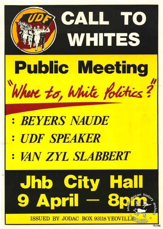 This poster is an offset litho in black, red and yellow, produced by the Johannesburg Democratic Action Committee (JODAC), Johannesburg. This poster represents the ‘Call to Whites’ campaign of 1986. The text reads “CALL TO WHITES: Public Meeting: "Where to, White Politics?”.Digitised by Specialised Archival Solutions in 2009. Reproduced in "Images of Defiance: South African Resistance posters in the 1980s" on page 41 (number 66) of the 1991 SAHA / Ravan Press edition and the 2004 SAHA / STE Publishers edition. |