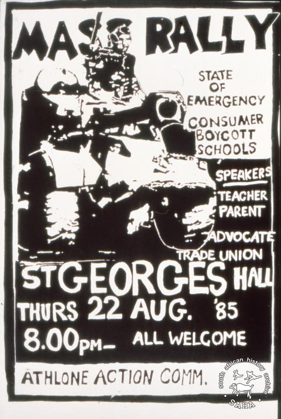 This poster is silkscreened black, produced by the Athlone Action Committee at the Community Arts Project (CAP), Cape Town. This image advertises a mass rally to discuss the State of Emergency, consumer and school boycotts. The text reads “MASS RALLY STATE OF EMERGENCY CONSUMER BOYCOTT SCHOOLS” Digitised by Specialised Archival Solutions in 2009. Reproduced in "Images of Defiance: South African Resistance posters in the 1980s" on page 78 (number 135) of the 1991 SAHA / Ravan Press edition and the 2004 SAHA / STE Publishers edition |