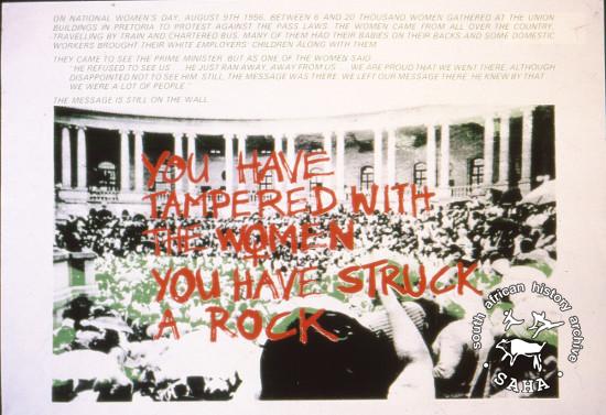 This poster is silkscreened black, green and red, produced by the Community Arts Project, Cape Town. This image refers to a slogan poster that became the rallying cry of women’s organizations. This image depicts women marching to government offices at the Union Buildings in Pretoria in 1956. The text reads: “YOU HAVE TAMPERED WITH THE WOMEN YOU HAVE STRUCK A ROCK " Digitised by Specialised Archival Solutions in 2009. Reproduced in "Images of Defiance: South African Resistance posters in the 1980s" on page 87 (number 156) of the 1991 SAHA / Ravan Press edition and the 2004 SAHA / STE Publishers edition |