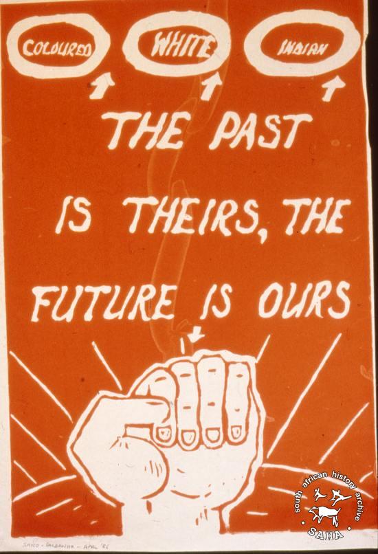 This poster is silkscreened red, produced by SAYCO in 1986, Saldanha. This poster publicises a youth congress' reaffirmation in its opposition to the apartheid's tricameral party.The text reads: "COLOURED WHITE INDIAN THE PAST IS THEIRS,THE FUTURE IS OURS". Digitised by Specialised Archival Solutions in 2009. Reproduced in "Images of Defiance: South African Resistance posters in the 1980s" on page 93 (number 168) of the 1991 SAHA / Ravan Press edition and the 2004 SAHA / STE Publishers edition. It also appears in the SAHA virtual exhibition - 'The Future is Ours: Commemorating Youth in the Struggle'. |