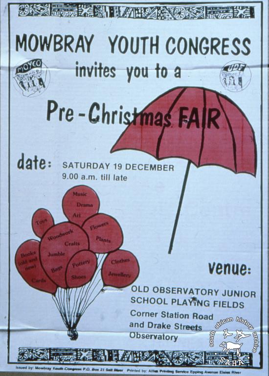 This poster is an offset litho in black and yellow, produced by the Mowbray Youth Congress. This image advertises a spring fair in Cape Town. The text reads: “MOWBRAY YOUTH CONGRESS invites you to a Pre-Christmas Fair “Digitised by Specialised Archival Solutions in 2009. Reproduced in "Images of Defiance: South African Resistance posters in the 1980s" on page 93 (number 170) of the 1991 SAHA / Ravan Press edition and the 2004 SAHA / STE Publishers edition. |