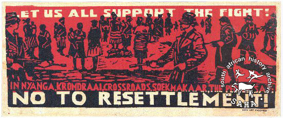 This poster is silkscreened in black and red, produced by Thami Mnyele and J Seidman, who based it on a woodcut by Figlan Mpikaypheli of the removals at Soekmakaas. The image shows blacks being forcibly resettled by men with guns. The full text reads: "LET US ALL SUPPORT THE FIGHT! : IN NYANGA, KROMDRAAI, CROSSROADS, SOEKMAKAAR, THE PEOPLE SAY: : NO TO RESETTLEMENT!". Digitised by Specialised Archival Solutions in 2009. Reproduced in "Images of Defiance: South African Resistance posters in the 1980s" on page 10 (number 14) of the 1991 SAHA / Ravan Press edition and the 2004 SAHA / STE Publishers edition. It also appears on page 73 of “Red on Black: The Story of the South African Poster Movement”, SAHA / STE Publishers, 2007. Additionally this poster can be found in the SAHA Exhibition Kit, under Women. |