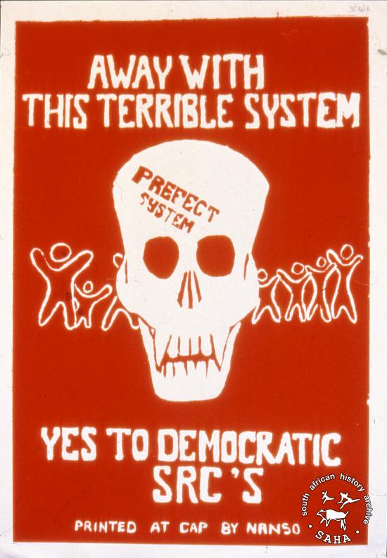 This poster is silkscreened red, produced by the Namibian National Students Organisation (NANSO) at the Community Arts Project (CAP), Cape Town. This poster refers to students who occupied Namibia so that they could echo the demands made by students in South Africa. The text reads: “AWAY WITH THIS TERRIBLE SYSTEM YES TO DEMOCRATIC SRC'S” on page 112 (number 205) of the 1991 SAHA / Ravan Press edition and the 2004 SAHA / STE Publishers edition. |